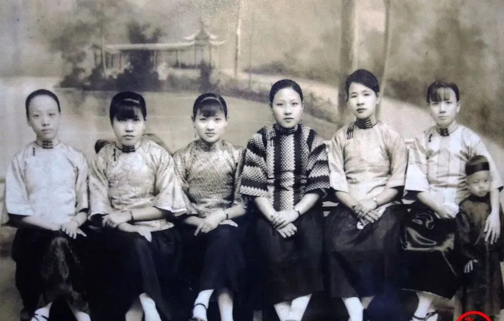 这张合影最有味道,绸面上衣压着小立领,袖口收得紧,坐姿一式端正,最右边还挨着个小弟弟探头看镜头,织纹、盘扣、短项圈,都把旧时女孩子的规矩与心气放在了一条凳子上,那会儿拍照可是件大事,得穿最齐整的一身。