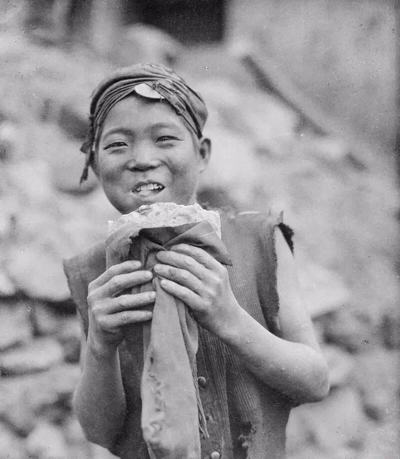 这个笑得最真,头上绑个碎布,脸上灰渍没擦净,怀里揣着布口袋,手里攥着一大块干饼,边角都被牙掰花了,图里的孩子是矿上的童工,高兴全写在吃上,以前干一白天也就换来这么口饼,现在小卖部里挑花眼,孩子们还会嫌硬呢。