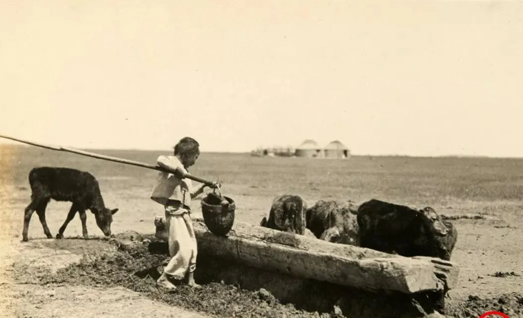 这个少年使的是长杆吊桶,前头勾住水槽边,手一抬一送,清水就泼进木槽里,小牛低头咂吧,远处白色的毡包点着草原,风把衣角吹成三角旗,小时候在乡下见过类似的,最怕的是打滑,脚下一歪,整桶水就扣在腿上了。