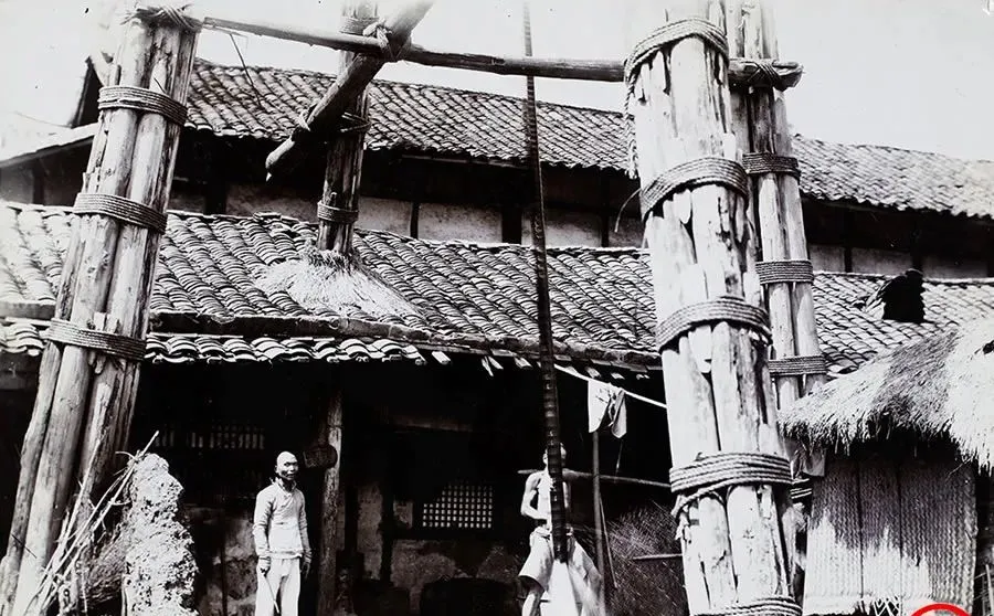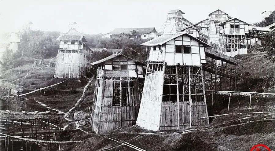 图中这一排高高矗立的木架叫井架,也有人喊天车,粗壮杉木绑成三四脚,麻绳缠得密密的,顶上搭一层小房遮雨,下面就是井口,工人踩着木梯上上下下,辘轳吱呀直响,木架跟山坡一字摆开,远远望着像一群站成阵的巨人。
