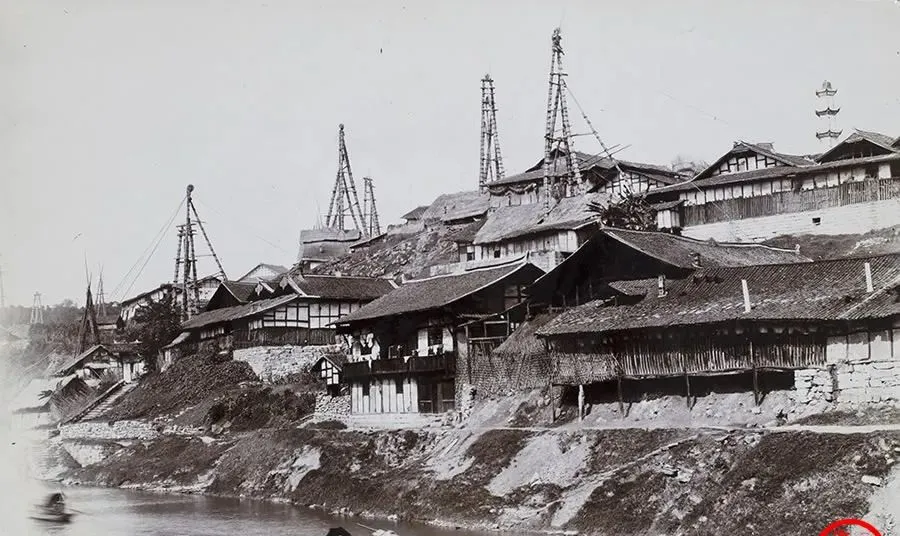 这个沿河一溜的是盐井和炼盐作坊,河岸砌着石台,黑瓦木屋紧挨着,屋后树起细高的钻塔,绳索从塔尖斜斜拉下去,风一吹哗啦啦,奶奶看见这张就说,早年过河闻见的不是水腥气,是卤水煮开的味儿。
