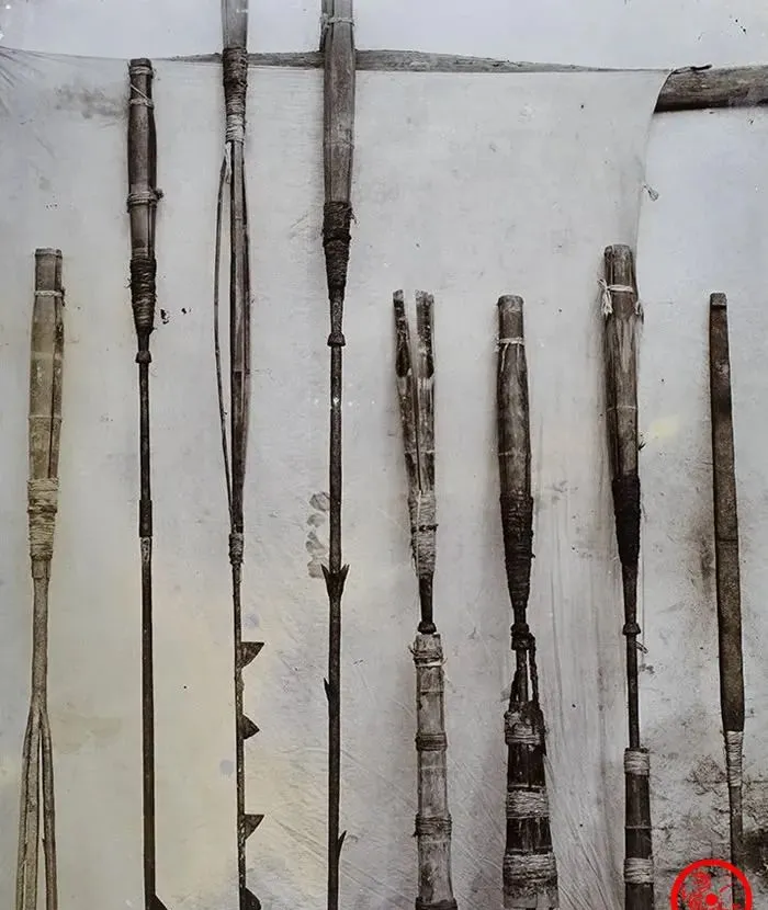 这一排细长的家伙是钻具,竹节一样的钻杆,头上套铁制的“圜刃”,有的一字口,有的三棱尖,还有“鱼尾”“梅花”的形状,师傅说不同岩层要换不同嘴,硬石头用尖的,泥岩用扁的,绑扎处裹着布和麻,汗水一上手就不打滑。