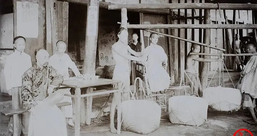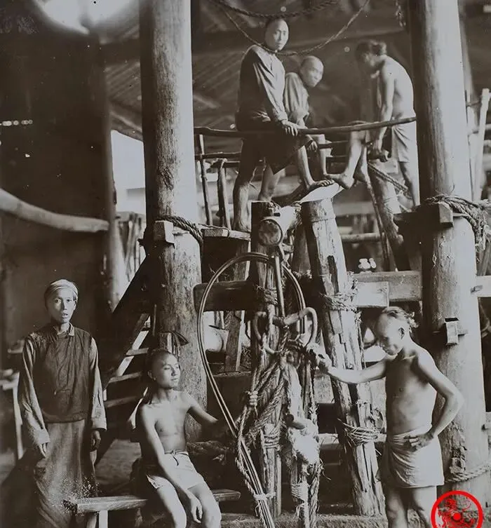 图里这个木栏围着的地方就是井口,几个人分开站位,一人扶绳,一人看水色,还有个孩子提着小桶跑前跑后,掌事的抬手一喊“停”,绞车立马刹住,耳朵里只有绳子摩擦的簌簌声,空气里是煤烟和卤水一股子冲味。