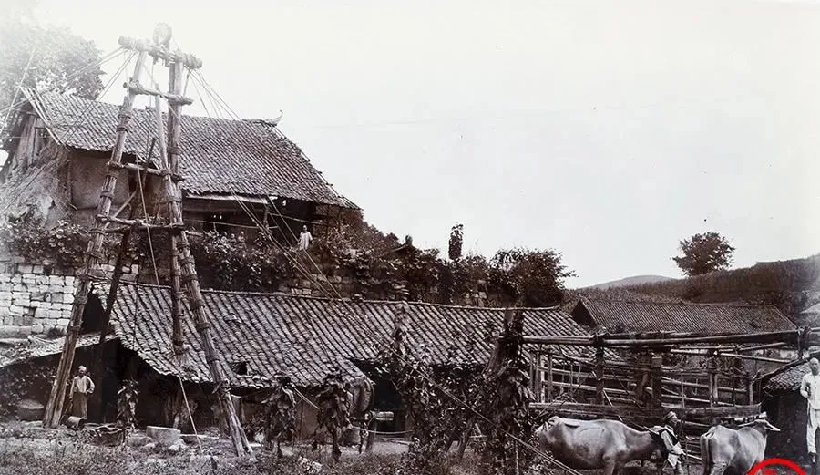这个院子里树起的三脚木塔,连着地面的大木轮,是牛拉绞车,牛脖子套着皮辔,慢吞吞绕着圈走,绳索从高处垂下去,一圈圈把卤桶带上来,以前人手不够就借牛力,现在呢,电机一点就转,牛在旁边闲得只顾甩尾巴。