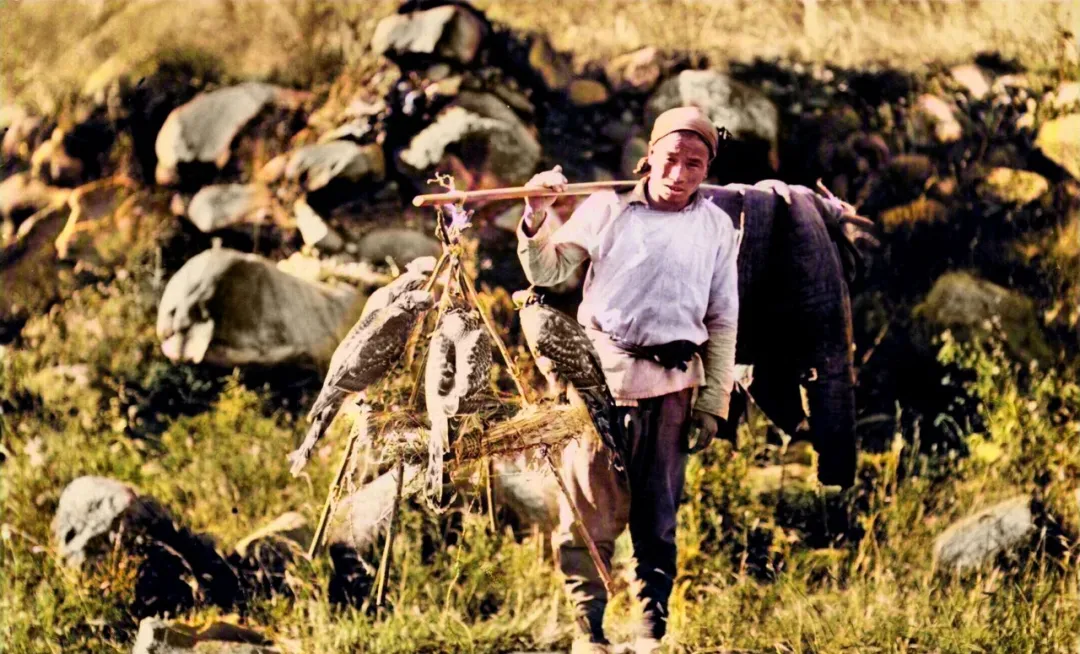 这张老照片可有意思了,北京郊外乱石坡上,一个小伙挑着扁担站定,扁担一头挂着棉衣,另一头拴着三根竹竿扎的三角架,干草缠在中间,几只眼神凌厉的鹰稳稳立着,像懂规矩的家伙,不扑不闹,只偶尔抖一抖翅尖,风从长城口子里刮过来,草穗一抖一抖的,仿佛都能听见旧时集市的喧哗了。