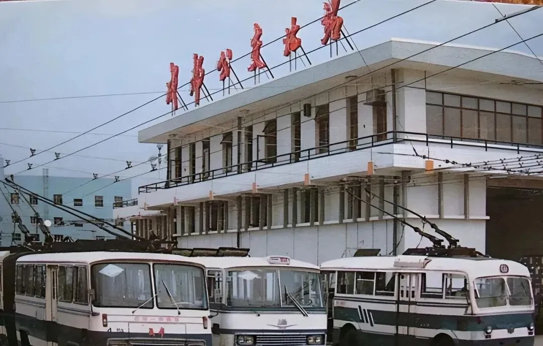 这个地方叫公交北站,屋顶一排红字跟旗子似的飘,最显眼的是大辫子加长电车,两节车厢中间连着蛇皮风琴包,抬头一看全是网架电线,叮当一响就要发车了。
