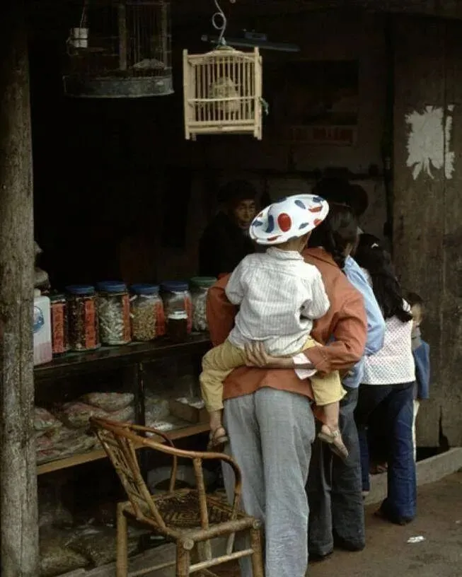 这个小门面叫杂货铺,玻璃瓶里装满五颜六色的糖豆,孩子被妈妈背在背篓式的带子上,指着红果片不肯走,老板娘用铁铲舀两勺,秤砣一挪,纸口袋一拧,甜味直接扑脸。