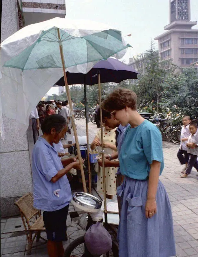 图里这条热闹街叫青年路,大华商店的牌匾金光闪闪,推车的、扛包的、拎网兜的全都往里扎,母亲凑近玻璃柜台看花布,售货员拿着木尺哗啦一拉,三尺一撕,动作干脆。