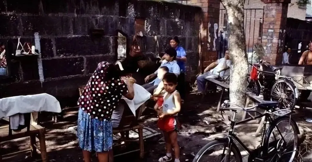 这个场景叫露天理发摊,长板凳一字摆开,镜子就钉在黑石墙上,理发师把围布一抖,推子嗡嗡叫,男娃剃个小平头,耳后抹一把清凉油,风一吹倍儿精神。