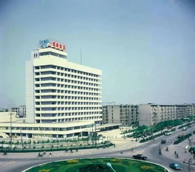 这个转盘旁边的高楼叫成都饭店,白墙灰窗,拐角像折扇,马路绕着圆盘走,车流一圈圈转,晚上霓虹一亮,第一次见到CHENGDU HOTEL英文牌子,我还拿作业本比划着照猫画虎。