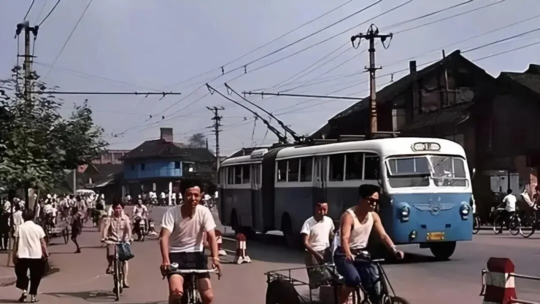 这辆蓝白配的就是成都1路电车,从北站一路摇到汽车总站,经过人民北路、春熙路、新南门,窗子上半截能推开透风,夏天乘客把手肘搭在窗框上,车里响着喇叭音乐。