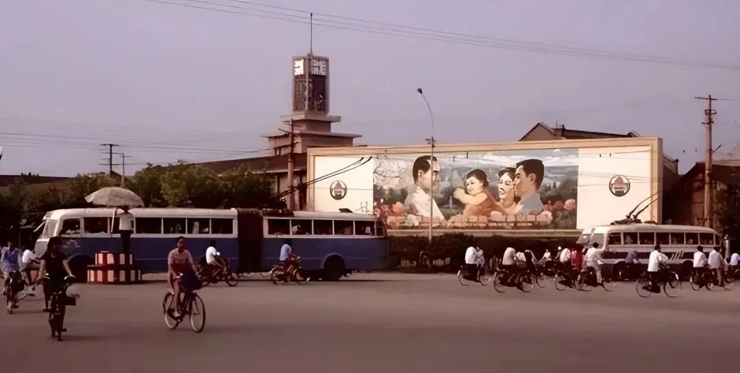 这个角落的墙体画报可有劲,旁边旧钟楼报时咚两下,电车拐弯哧溜一下拉出火花,那会儿到处都在宣传计划生育,画上的小两口抱着娃笑得甜。