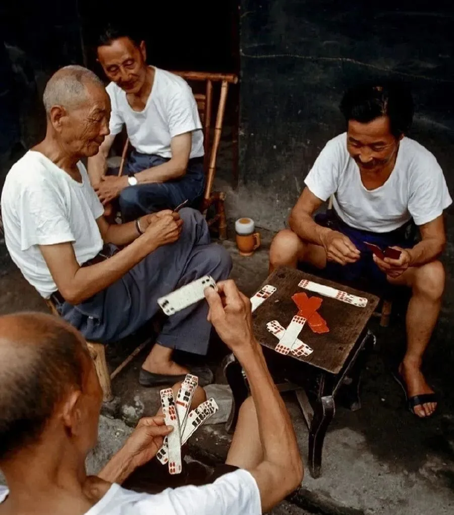 这个桌面上的玩意儿叫长牌,白胚牌上红点黑点排成阵,几位老哥端着竹椅围一圈,出牌时指尖一扣,牌面在方桌上啪的一声脆响,旁边搪瓷缸里泡着茉莉茶,笑骂里全是江湖。