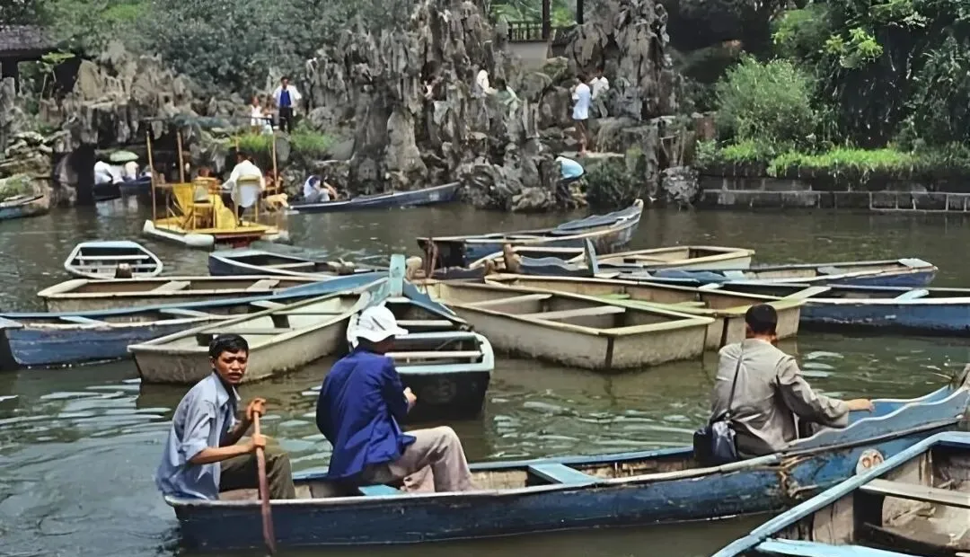 这个湖面是人民公园的游船水域,木船漆成蓝边白肚,船桨入水拖出一条银线,岸边石山洞里透出凉气,我们抢着上船,妈妈叮嘱别伸手摸水,怕一滑要掉下去。