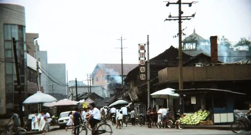 这处转角是椒子街口的小市场,摊棚下西瓜堆成山,电线杆子冒着烟味,旁边就是老屋檐,买菜的大爷把秤往肩上一扛,拐进巷子两步就到家。