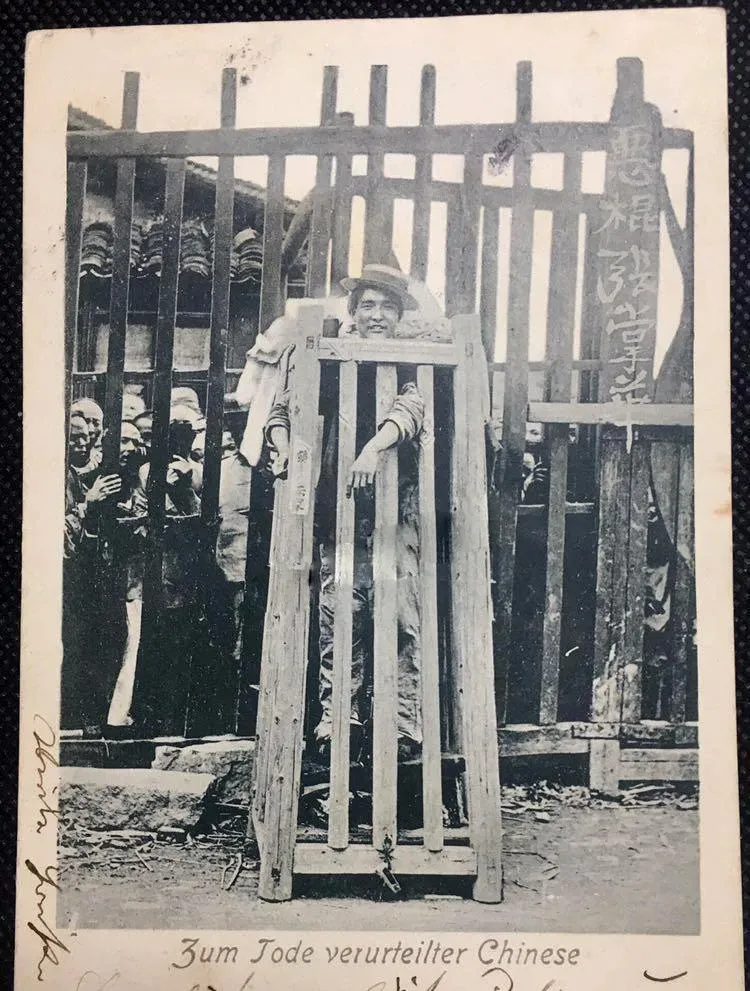 图里这口木架子叫站笼,四根竖木两道横梁,最下边留着几块可抽的木板,活络得很,犯人被困在狭窄格里,只能直挺挺站着,腰弯不了,脚下那几块板一抽,整个人就悬着了,气管被勒住,憋得眼冒金星,衙役就靠这个一寸一寸地收命,别看木头粗糙,角边却磨得油亮,显见用得勤,老照片里人多,笼子更显得冷。
