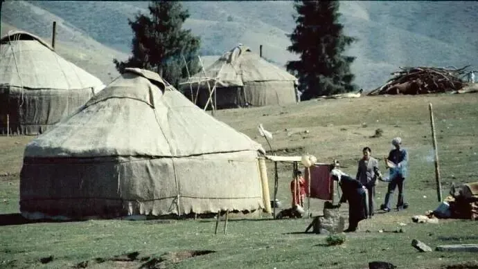 图中这顶圆滚滚的叫毡房,外层厚毡灰白发黄,里头木架成圈支着,门口搭一片小棚,晾着衣被锅碗,风从坡上吹下来,毡边轻轻抖着,奶茶味沿着缝隙往外飘,小时候我路过时总忍不住探头看一眼,里头黑亮的火炉上咕嘟咕嘟响着,主人笑嘻嘻递一块奶疙瘩,说,嚼着不渴。
