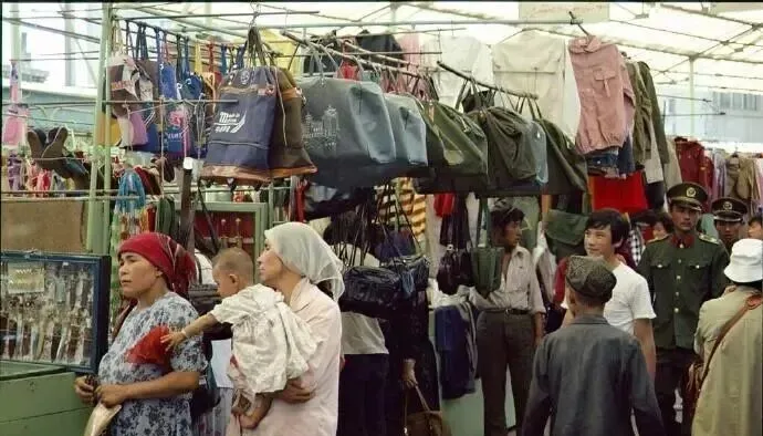 这个屋顶下的热闹叫小商品市场,布帘子上挂满手提包和衣服,深蓝的绿油油的都在晃,来赶集的挤成一团,伸手挑一挑,商贩抬眉一笑就报个价,不急,慢慢砍价,那会儿买东西讲究手快眼准不冲动。