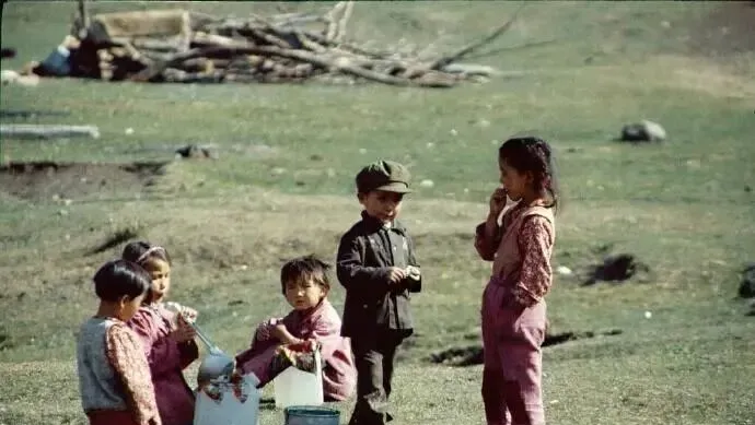 这几个小不点手里的白塑料桶,用来接山泉水或装酸奶,桶口绑条红绳,晃来晃去叮当脆响,男孩戴着小军帽站得直直的,女孩捏着辫梢打量他,谁家大人一招呼,几个一溜烟跑没影,尘土在阳光里起起落落。