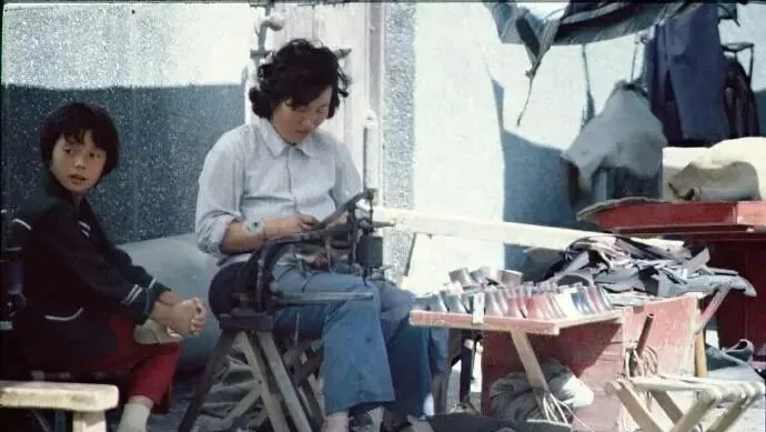 这个带着脚踏机的小摊,咱们就叫修鞋摊,铁机身黑亮,轮子一压一松,针线呲溜穿过去,女人低头一针不差,旁边小男孩托腮看着出神,口袋里揣的几毛钱烫手,等着补好那双最合脚的布鞋。