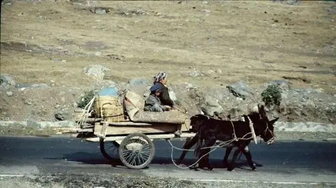 这辆只装了两筐家当的驴车,一路贴着黑油油的柏油路走,木轴在颠簸里吱呀,赶车的女人眯起眼朝前看,山坡上草短风硬,白云像被人拢着往前赶,慢,但稳。