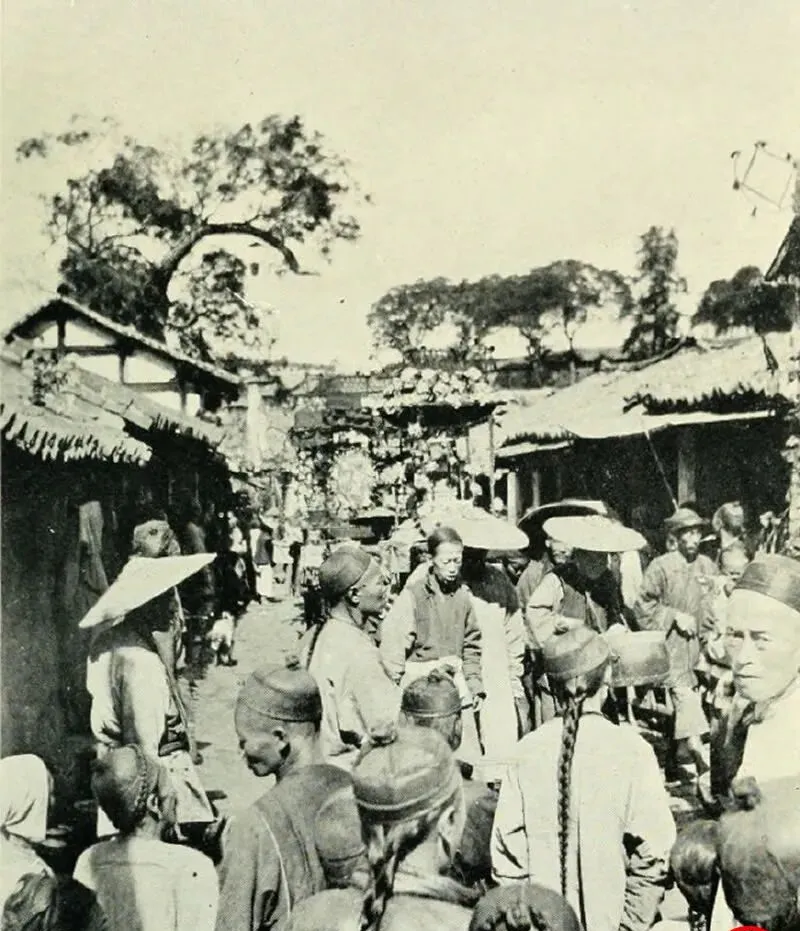 这条街的热闹不用解释,图里男人背脊挤着男人,辫梢一根根垂在背上,前头有人抬杠卖力吆喝,后头有人探着脖子看热闹,阳光打在斗笠上,反着一圈白光,以前逛集得挑天晴,现在动动手指就送上门,热闹还在,却没了肩与肩的挤挨。