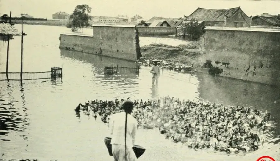 这片翻滚的黑白水花是鸭群,前面那人拿簸箕铲糠,后面那人赶着队形往浅滩走,墙根开了个口子,像给它们留的门,鸭子们哄哄哄地跟上去,尾巴一摆一摆的,外婆说靠水吃水,涨落都看天脸色,现在养殖讲配方讲温棚,手上一把糠也能成学问。