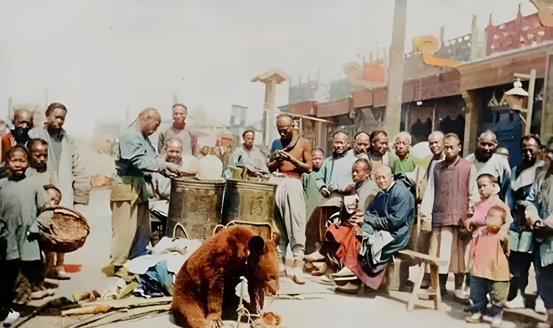 老照片:1905年北京街头,小吃摊前被迫表演的黑熊,太可怜了。