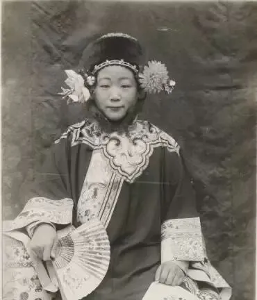 这个硬翅下面的头路是满洲挽髻,发根抹得锃亮,鬓边别花,后脑勺垫木板或丝绵,拍照那会儿先要坐稳,让照相师傅瞄一会儿焦,别乱动,不然发饰一歪,全得重来。