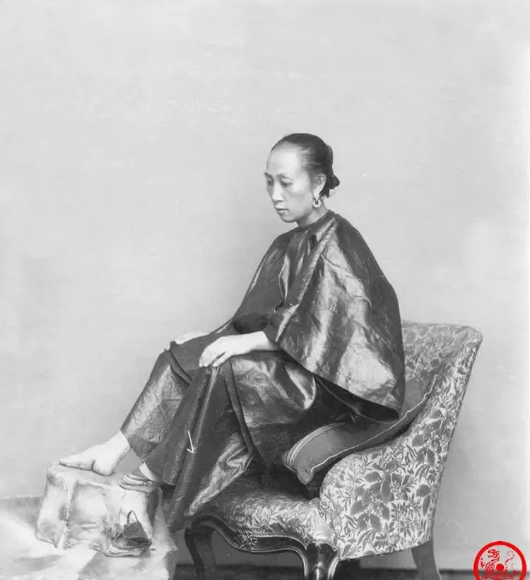 图中这只小鞋叫三寸金莲鞋,绣面是缎子的,鞋尖翘得厉害,脚背被紧紧裹着,只露出白生生的脚趾头,女子坐在软榻上,把鞋轻轻推到石墩旁,像是在给镜头一个交代,奶奶说那会儿女人在外头不爱露皮肤,这样把鞋退下让人看,可真是要下很大决心的,照片背后的尴尬与坚忍,都写在她不抬眼的侧脸上。
