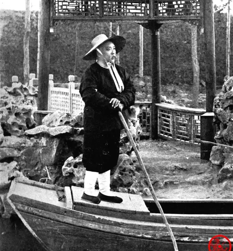 这身打扮叫渔夫行头,草帽宽檐,脚下是小木船,手里却攥着一根更像摆拍的篙,细看身后假山玲珑,亭子雕花透空,水面规整得像新漆一样,豪华庭院里装渔父,这种反差挺扎眼的,爷爷笑过一句,人家说是散发天涯去,可眼角的精神劲儿一分没少,像极了猫蹲在洞口,表面打盹,耳朵却没合一下。