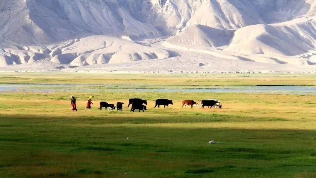图中这条开阔的草地叫牧道,前头有人牵着牛羊慢慢往前赶,远处是被风刮白的山体,像盐堆一样亮,牛铃一响一停,风声就把空旷塞满了,奶奶说那会儿赶一群牲口要走大半天,脚底沾着湿草味回到家,一锅奶茶翻着花。