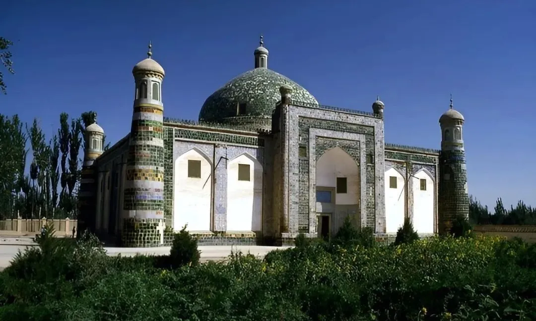 图中这座古建叫阿帕霍加麻扎,青绿的琉璃砖顺着墙面起伏,穹顶圆得发亮,门洞嵌着花纹,阳光照上去像水在流,妈妈说第一次见到时只会抬头傻看,脚跟都站酸了。