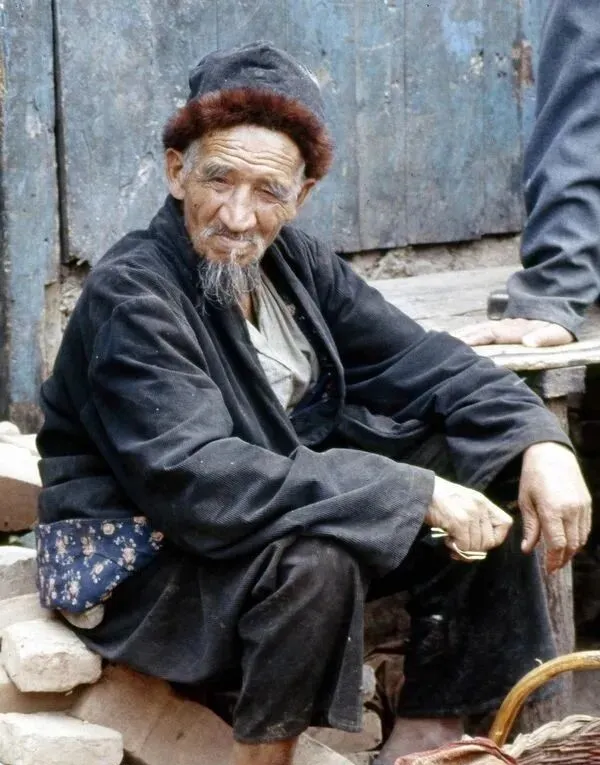 图中这位老人穿一身黑棉袄,坐在砖头边,眼睛眯着看人来人往,手里攥着啥也不松,胡子顺着风抖两下,谁家买了新锅碗瓢盆路过,他就笑着点点头。