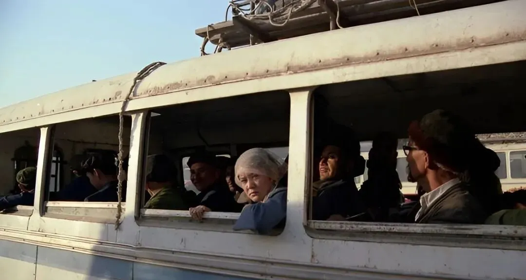 这辆是长途客车,车窗没玻璃或只装了半扇,老人探出头来透气,车厢里一排人挤得肩碰肩,车顶捆着行李网,发动机一吼,满车人心都跟着往前扑,妈妈说以前出趟门得带干粮,现在高铁一晃就到。