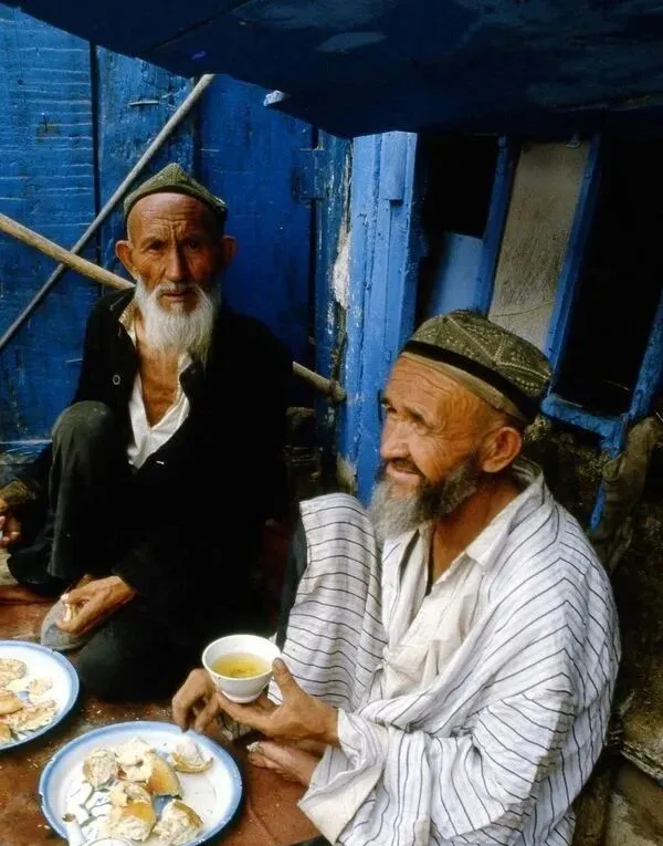 这两位端着茶碗,搪瓷盘里撕着馕,蓝色木门掉着漆,风一吹吱呀一声,老伙计你递我一块,我给你添一口,话不多,一顿简简单单的饭也暖人。