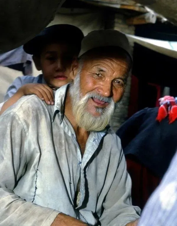 这个笑脸最耐看,老爷子胡子花白,背后探出个小脑袋,手搭在他肩上,亲得很,镜头凑近了也不躲,眼角的纹路都弯成了月牙,日子虽不富裕,脸上有光。