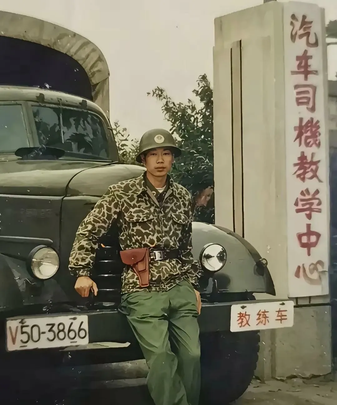 你看到这张老照片的第一眼是不是也愣了一下,头盔压得低低的,81式伪装衣泛着旧日的绿,腰间一只棕皮枪套特别扎眼,身后牌子写着“汽车司机教学中心”,啧,这架势一看就不一般,很多朋友大概已经想到了,他不是在前线冲锋的那个尖刀,却是把部队整盘棋子推得动起来的那个汽车兵,也是能把你我爸那代人吹上三天三夜的兵种之一。