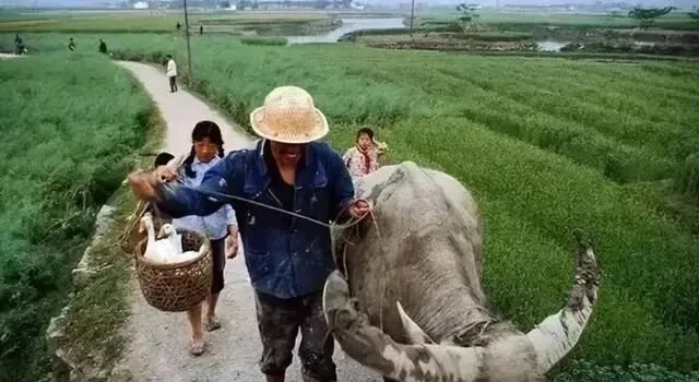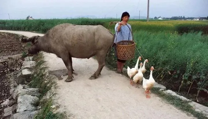 图中这阵仗叫乡路巡游也不为过,一头灰背水牛慢悠悠顶着角,篾篮拎在手里,前面三只白鹅昂着脖子当领队,牛不急,鹅不慌,窄窄石路两边是油绿油绿的田,风一吹,麦苗像在给它们鼓掌,小时候跟在牛尾巴后头捡落麦穗,奶奶在后面招呼我别踩沟沿,掉下去可就湿身了。