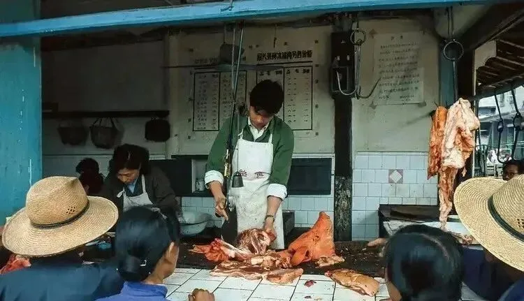 这个场面就是老肉铺,案板白得发亮,师傅肩上挂着小秤,刀口落下去脆生生的,前面围着戴草帽的主顾,都是挑着菜来顺手打两斤肉的,妈妈说那会儿讲究肥瘦分明,做酱油肉要挑五花,回锅片子肉就得瘦里带点筋,师傅抬刀问一句要几两,手腕一抖,称星子一指,准得很。