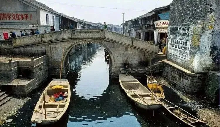这座石桥是往来两市的咽喉,桥洞下泊着小木船,岸上墙体还刷着标语,桥面窄,挑担的要侧身错过,肩上的扁担吱呀一声,把一天的忙碌都压在了那一瞬,走过桥风大些,帽檐得按住一点,不然就要被吹翻了。