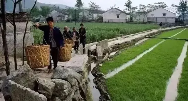 这条走的是田埂路,前头一个肩挑大篮,后头一串跟着学样,石块垒成小堤,水渠在脚边咕嘟咕嘟,脚下要稳,一打滑就连人带担下去了,走熟的人脚背都不抖一下。