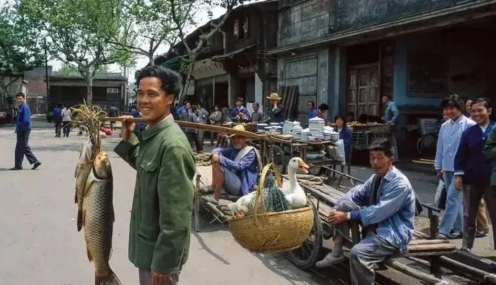 这个小贩把扁担玩明白了,一头挑着两条大鲤鱼,另一头篮里卧着一只白鹅,笑得像刚做成一笔好生意,路边的人围上来问价,他抬手一比划,今天的新鲜,看得见摸得着。