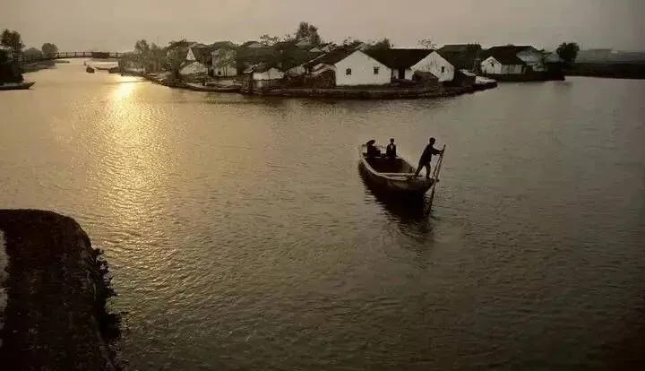 这张最有味道,夕阳把水面涂成金色,三个人的船慢慢往回走,岸边一排粉墙黛瓦像浮在水上,那时候有手机吗,没有,有的是天色,看一眼就知道今天要不要下雨。
