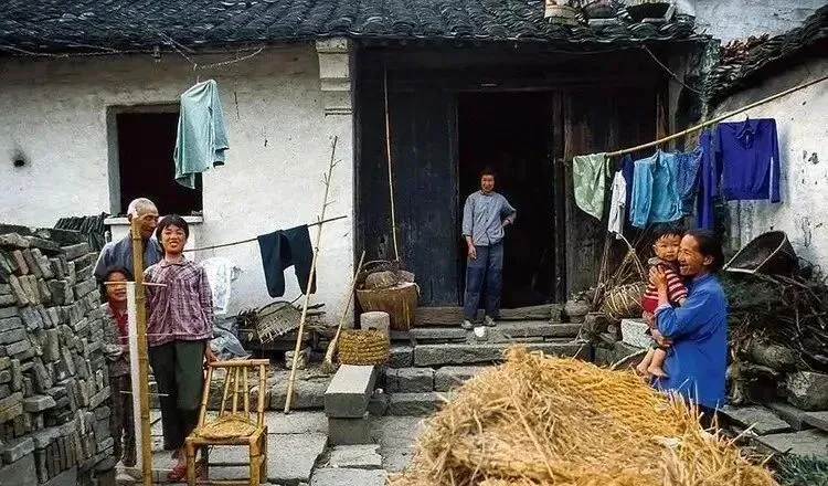院子里砖石垒成的台阶,草垛靠在屋檐下,晾衣绳上挂着半干不湿的衣衫,抱孩子的男人逗得娃直笑,屋里的人站在门口应声,晚饭的米香已经从灶间透出来。