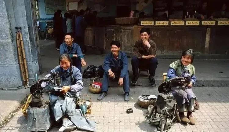 地上摆着老式修鞋机,几个师傅边干活边聊天,鞋跟咔嚓一声夹住,再往外一拉,线就走了个紧,坐旁边的年轻人笑得见牙不见眼,活路虽不轻松,却不缺笑声。