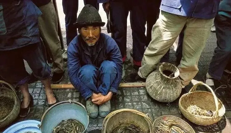 这个老汉蹲在地上守着几只篮子,里面全是泥鳅黄鳝和小杂鱼,水盆边沿被手磨得发亮,他抬头望一眼路人,再低头挑拣活跃的那几条,买回去一锅葱烧,香得很。