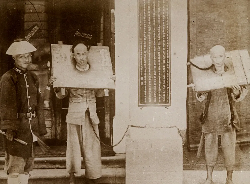 这个抠在木缝里的手指细节,很说明问题,叫撑缝,人把手指卡在枷边的小口里,想借一把力把板子稍微撬起一点,让脖颈能喘口气,动作看着小,力气却要命,撑久了手指肚子会发紫,指甲里全是汗水和尘土,我看照片就能想起木头与皮肤摩擦的涩声,干巴巴的,像砂纸蹭在耳畔。