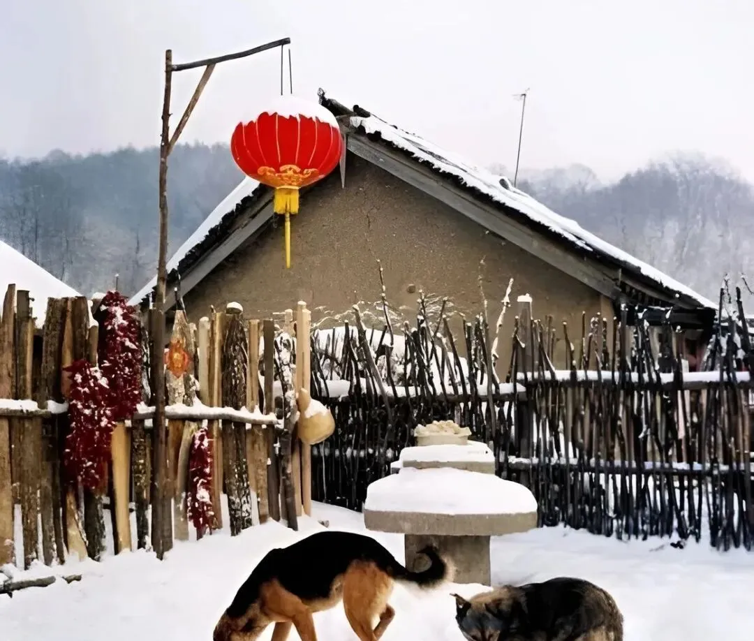图里这院子头件扎眼的就是红灯笼,粗木杆子挑着,灯帮子厚实,雪压在边沿一圈白牙,篱笆上串着辣椒和苞米穗,狗子在雪地里拱来拱去找骨头,过年就该是这个样子。