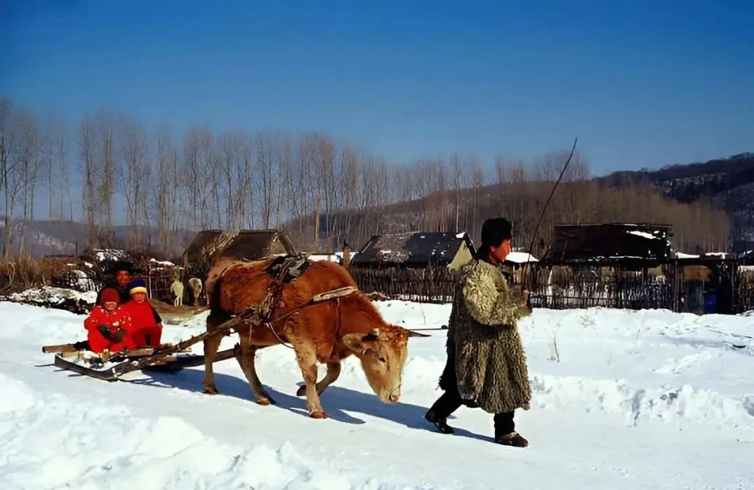 这个交通工具叫牛爬犁,木板拖着两道滑梁,前头勒在牛肩上,孩子穿大红棉袄坐在后面笑得直眯眼,叔叔披着羊皮袄,甩一声响鞭,爬犁在雪面上哧溜哧溜地跑。